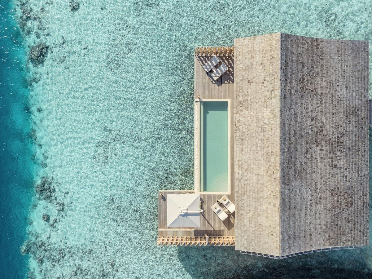 The Two-Bedroom Ocean Pool Residences at Kudadoo Maldives Private Island offer the same elegant design as the one-bedroom retreats, with added space for families or groups. Featuring uninterrupted 180-degree views of the Indian Ocean, expansive sun decks, and ample lounging areas, these residences comfortably accommodate up to four adults. Embrace wellness with yoga on your private deck or enjoy a unique dining experience at the glass table while admiring the marine life beneath your feet.