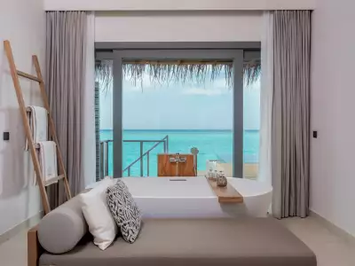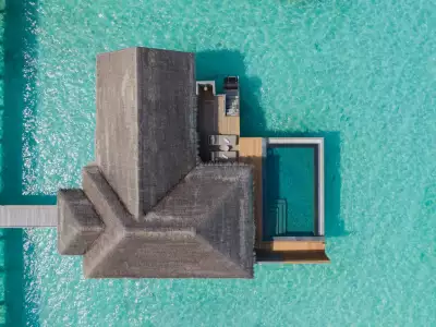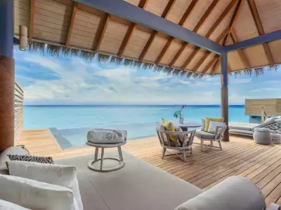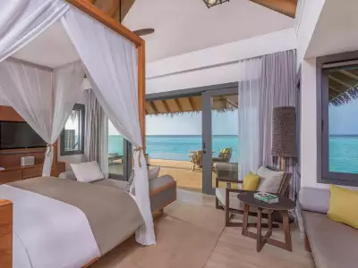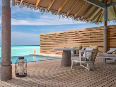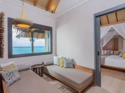 Ideal for families with two adults and up to three small children, the Family Overwater Villa with Pool at Vakkaru Maldives offers the perfect blend of space and comfort. A separate sleeping area for kids—partitioned by sliding doors—ensures privacy, while parents enjoy a serene master bedroom with en-suite bathroom. Outside, a spacious deck with sun loungers and a private infinity pool invites the whole family to unwind and soak in the beauty of the Maldives together